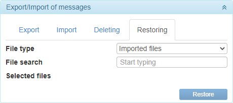 On this tab, you can restore the files imported previously and the files during the import of which an error occurred. As a result of restoring, the files are moved from the /home/wialon/wlocal**/tmp/exp_imp_dir/imported_files/** and /home/wialon/wlocal**/tmp/exp_imp_dir/import_failure** directories to the /home/wialon/wlocal**/tmp/exp_imp_dir** directory. After that, you can import these files again.