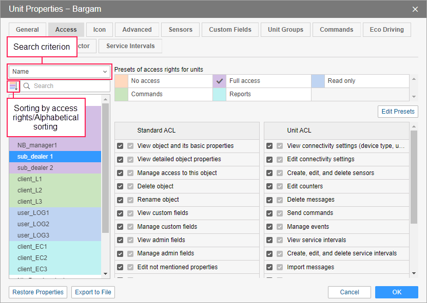 The presets facilitate and speed up the assigning of access rights. You can create different sets of rights for different roles, for example, for operators, managers, customers, etc. Moreover, personal presets can be made for each type of object (unit, route, etc.). The created presets are then applied to the selected users with a single mouse click.