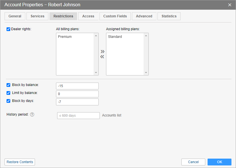 On this tab, you can give dealer rights to the user of the account, adjust the blocking settings, and specify the history period for the account.