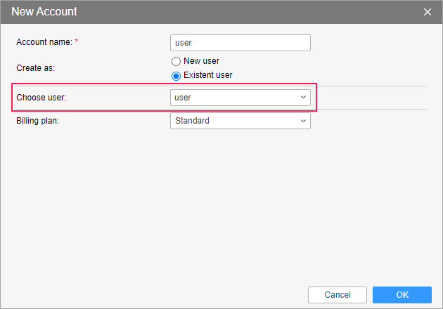 Choose user | This parameter is available when creating an account on behalf of an existing user. In the drop-down list, select the user that should be considered as the account creator. You can select only those users in the properties of which the Can create objects option is enabled. If the selected user is already a creator of macro-objects, the Billing plan field becomes inactive, and it is impossible to create the account, because this may violate the hierarchy principles. However, you can specify such a user as the creator of a resource. If the creator of the selected user doesn't have dealer rights, it is impossible to create the account. |