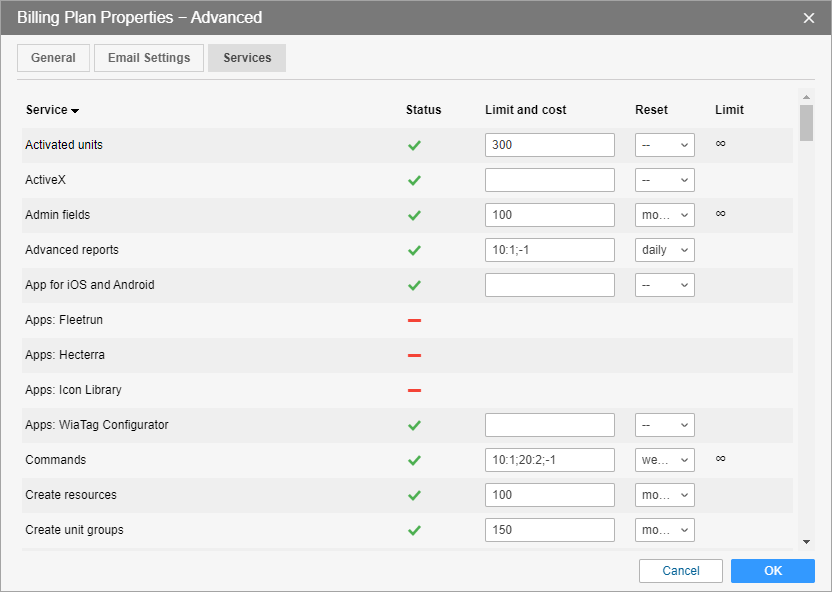 Limit and cost | In this column, you can specify the values of the service quantity and cost. For example, if you specify number 100 for the Units service, this means that no more than 100 units can be created in the accounts to which this billing plan is assigned. You can indicate the limit and cost for the billing plan in the same way as for the account. You can also specify the service limit and cost individually for each account on the Services tab of its properties. These values can be more than the values from the billing plan properties, but not more than the values from the Limit column. |