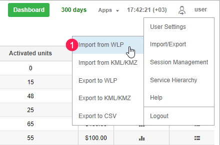 - In the user menu, select Import/Export item and then click Import from WLP.