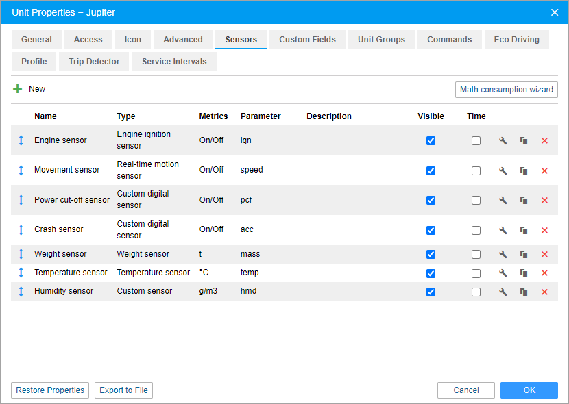 Only the units created in Wialon can be registered as vehicles for transmitting data to Wasl. Before starting the registration, make sure that the sensors described below are configured in the unit properties.