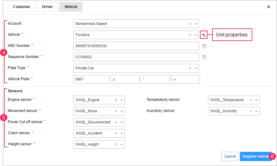 The required fields are marked with an asterisk (*). All the fields, except for the IMEI number, are not editable after the vehicle is registered.