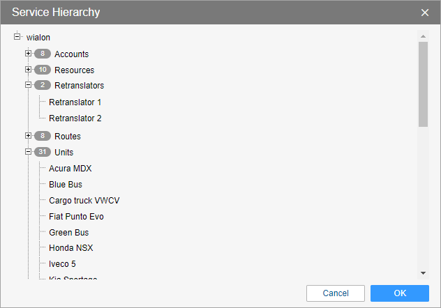 Service hierarchy is a sort of report with a schematic representation of the information concerning the structure of your service. Select the corresponding item in the user menu to generate a table containing information on the types of macro objects used in your service, their amount, and the way these objects correlate with each other.