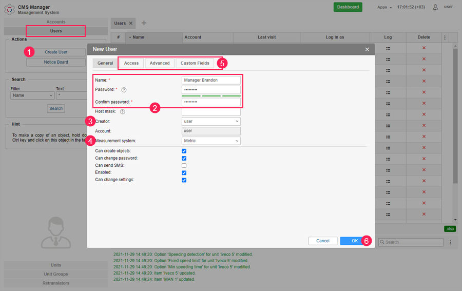 - manually using the Create user button (the Users section in the management system) or the Create button (the Users tab in the monitoring system).