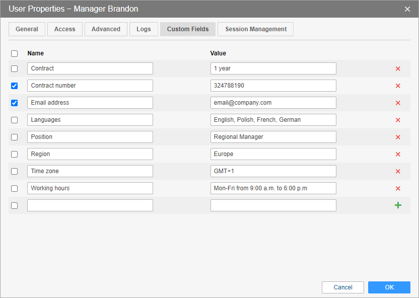 On this tab, you can create custom fields with additional information about the user.