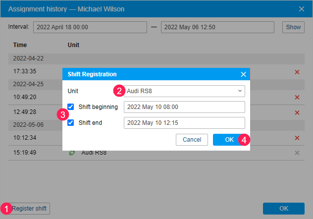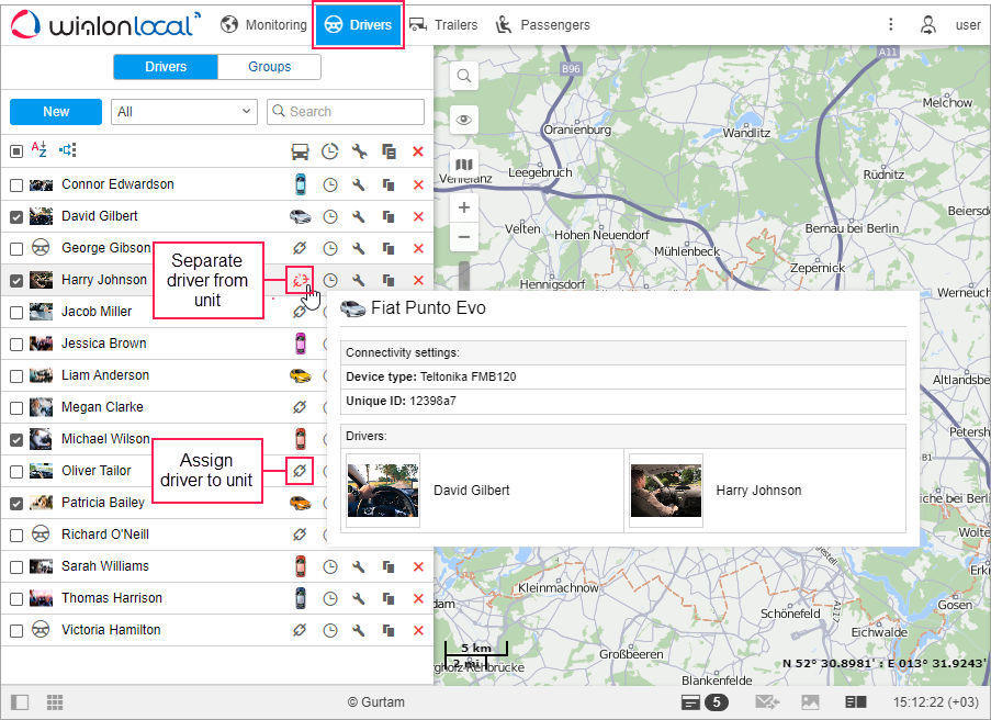 Drivers can be assigned to units manually or automatically. After that, you can work with the assignment history.