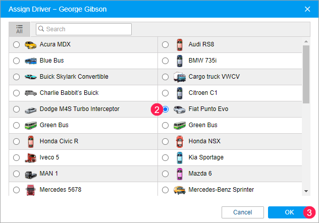 - In the open window, select the unit to which you want to assign the driver. Here you can see the units from the work list on the Monitoring tab. To see all units to which you have the View object and its basic properties access right, click on the icon