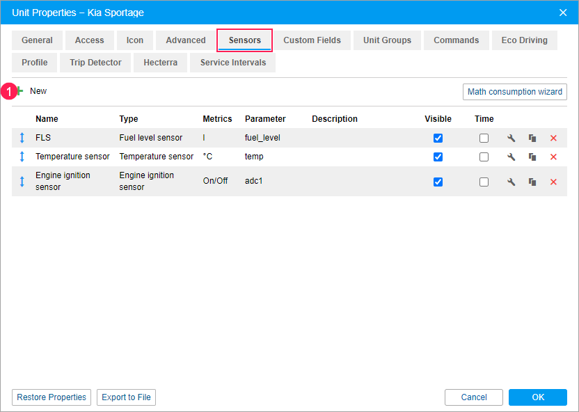 ) on the Sensors tab in the properties of the required unit.