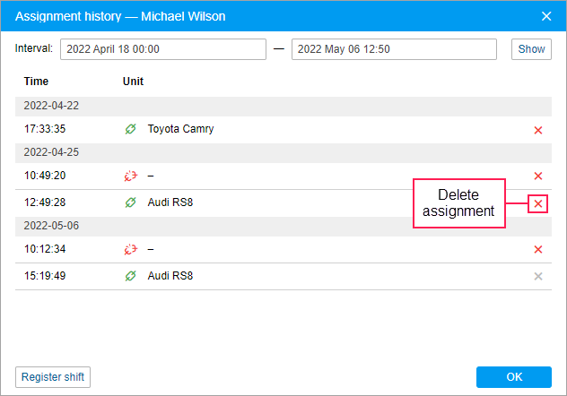 To view the assignment history, specify the required interval and click Show. In the list of assignments, you can see the name of the unit, the date and time of the driver assignment and separation from it.