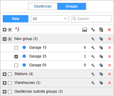 Created geofences can be formed into groups. Groups are used to unite geofences on the basis of any criteria and serve as parameters of interval filtration in several report templates. Moreover, groups of geofences are used in the notifications of the corresponding type.