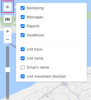 Such tabs as Monitoring, Tracks, Messages, Reports, Geofences, Routes, Drivers, Trailers and Passengers can have their layers on the map. Graphic elements applied to a map when working on a particular tab can be easily switched on and off. Displaying or hiding the graphic information on the map is adjusted for each layer individually in the layers menu, which can be opened by clicking on the Eye icon in the upper left corner of the map. Here you can read more about the work area.