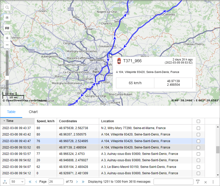 In the table with data messages, you can see the time of the message, the speed and location of the unit at the time of sending it, and other available parameters. In addition, you can find summary information on the results of the query in the Statistics section.