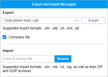 To export messages to a file, open the Export and import messages tab in the lower left section of the window. Select the destination format and click Export. Depending on your browser configuration settings, you will be offered to open or save the file. The file with exported messages can be compressed. For this, leave the checkbox Compress file marked.