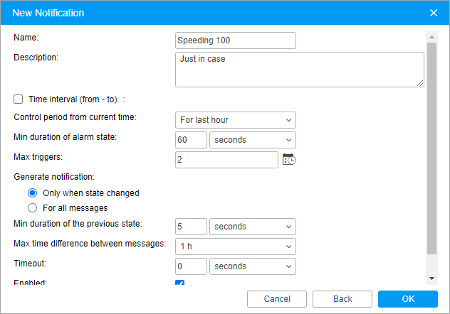 Max triggers | The maximum number of times the notification can be triggered. When this limit is reached, the notification is automatically disabled. You can set a time limitation for this parameter (icon ). In this case, the limit on triggers is applied only to the specified intervals, that is, the notification can be triggered any number of times outside of these intervals. When a notification is triggered, the time of message registration on the server is taken into account, and not the time of message generation. Therefore, when a message is sent from the black box, the notification can be triggered even if the message has been generated within the specified interval, and the limit on triggers has already been reached. |