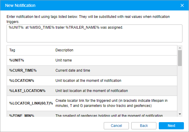 If the data is unknown, the tags are displayed as they are (not substituted with any values). The exceptions are the following tags which do not appear in the notification text when there is no data: %UNIT%, %USER%, %CURR_TIME%, %LOCATION%, %LAST_LOCATION%, %SPEED%, %POS_TIME%, %MSG_TIME%, %UNIT_GROUP%, %ENGINE_HOURS%, %MILEAGE%, %LAT%, %LON%, %LATD%, %LOND%, %GOOGLE_LINK%, %INSURANCE_CASE%, %ZONES_ALL%, %ZONE_MIN%, %UNIT_ID%, %MSG_TIME_INT%, %NOTIFICATION%, %TAG_NAME%, %TAG_ID%, %LOSE_RESTORE%, %LOCATOR_LINK%.