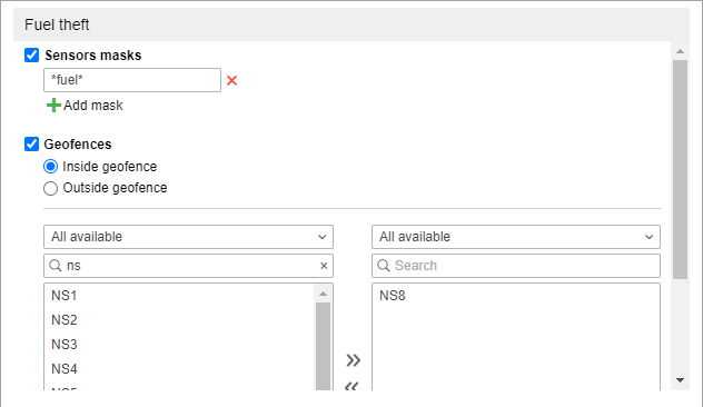 Notification of this type allows you to monitor fuel thefts. When creating a notification, you can specify the sensor masks that should be used to estimate fuel thefts and their volume. Also, using the Inside geofence and Outside geofence options, you can monitor fuel thefts for certain geofences (must be created in advance). Select the resource whose geofences should be shown in the list (select All available to view the geofences of all available resources). Also, choose the geofences or groups of geofences (shown in the square brackets), for which this notification should work. For the search convenience, you can use the dynamic filters above the lists.