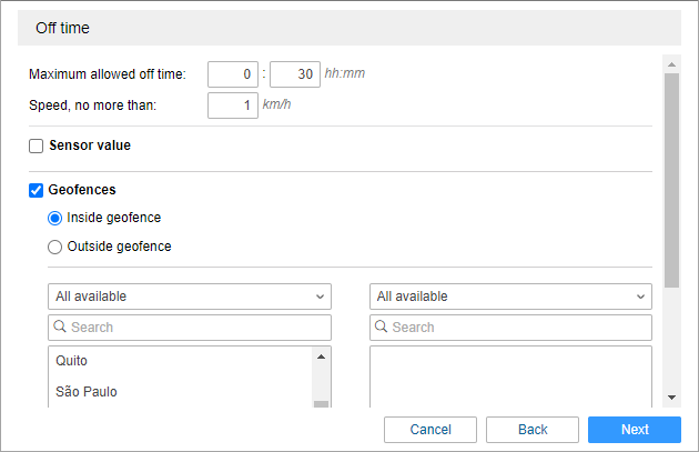 In the Max allowed off time field, you should specify for how long a vehicle can be parked; and in the Speed, no more than field, you should indicate what speed shouldn’t be exceeded during off time.