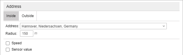 This type of notification is similar to geofence control. It allows you to control the entrance/exit or being in or out of a particular place. Enter some address parameters (e.g. city, street, and house) and then select the most appropriate option from the found addresses. Also, specify the radius of the point. In addition, filters for the sensor and speed can be applied.