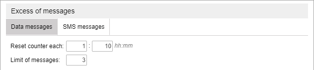 With this type of notification, you can be warned if a unit exceeds the limit of messages you have set. This can be either ordinary data messages or only SMS messages. Indicate the limit of messages and set the reset interval. For example, if you configure a notification, as shown in the example below, the notification will trigger if the unit sends 3 or more SMS messages within 1 hour 10 minutes.