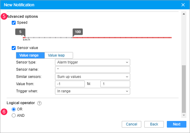 In the Advanced options section, if necessary, specify the additional conditions under which the notification should be triggered. It can be the range of speed values (the Speed option), and/or the range or the difference of the selected sensor values (the Sensor value option).