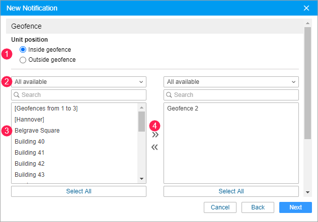 In the left list, select the geofences or groups of geofences (displayed in square brackets) for which the notification should be triggered. You can use the dynamic filter above the list to search.
