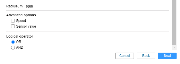 | Logical operator | The value on the basis of which the notification is triggered. If OR is selected, the notification is triggered when the unit approaches or moves away from any of the selected units. If the logical operator AND is selected, the notification is triggered when the unit approaches or moves away simultaneously from the marked units. |