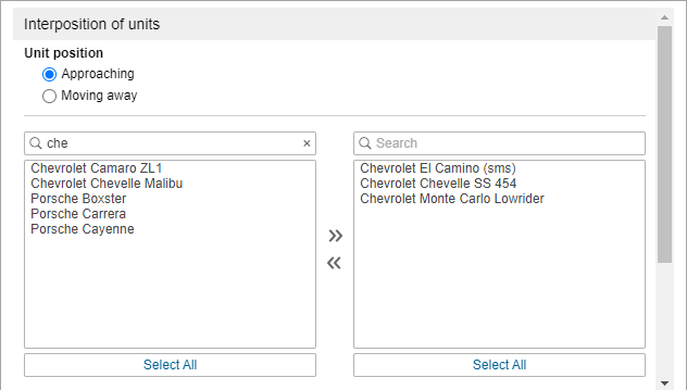 This notification allows you to control the interposition of units: their approaching and moving away from each other. Select the criterion (approaching or moving away) and transfer from the left list to the right one the units whose approaching or moving away should trigger the notification. You can use the dynamic filter above the list to search.