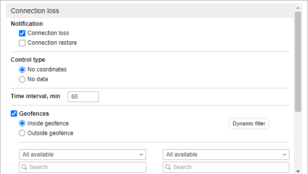 Using the Geofences option, you can monitor connection loss in regards to specific geofences or groups of geofences. Specify the control type: trigger inside or outside a geofence. Select the resource whose geofences should be shown in the list (select All available to view the geofences of all available resources). Select the geofences or groups of geofences (shown in the square brackets), for which this notification should work.