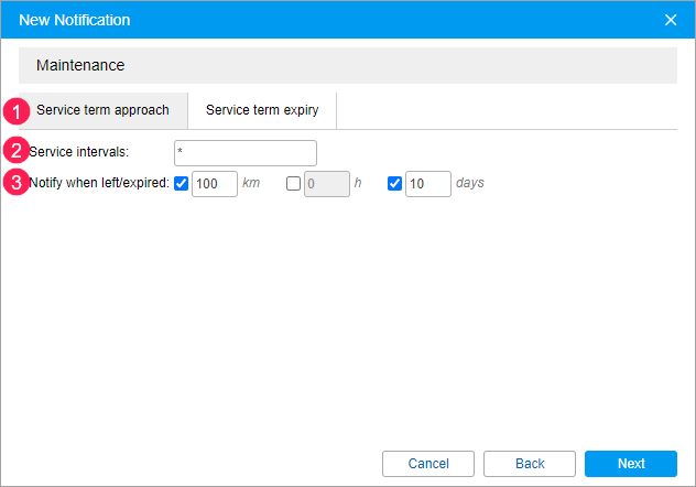 To be notified of the service term approach, specify how many kilometers, hours, and/or days should be left before the beginning of the service term so that the notification is triggered. To be notified of the service term expiry, specify how many kilometers, hours, and/or days should pass after the expiration of the service so that the notification is triggered.