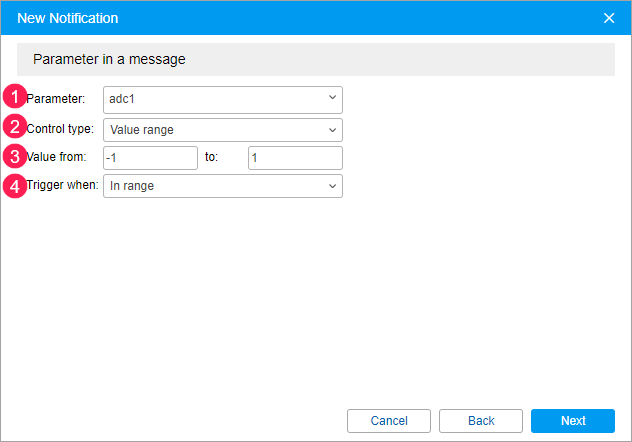 - Out of range. The notification is activated when receiving values which don’t fall in the specified range.