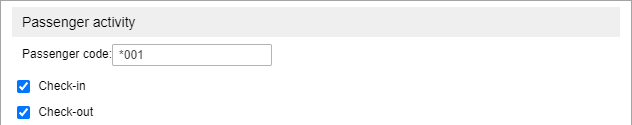 To receive notifications of passenger’s activity, choose the control type (check in/check out) and enter the passenger’s code or code mask. You can add several codes or code masks separated by commas without spaces. If you leave the asterisk sign (*) in the field, all the passengers will be controlled.