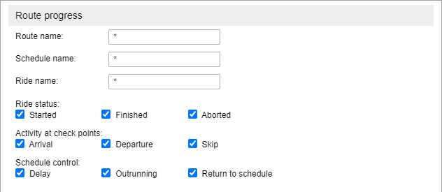 To control the route progress, select the changes that should be controlled when fulfilling rides of this route: ride status (started, finished, aborted), activity at check points (arrival, departure, skip), schedule control (delay, outrunning, return to schedule).