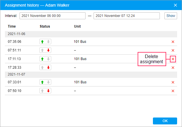 To view the assignment history, specify the required interval and click Show. In the list of assignments, you can see the date and time of the passenger’s assignment or separation, the passenger’s status and the name of the unit.