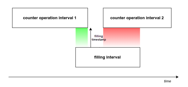 If there was no such match, the algorithm searches for the intersection of the entire fuel filling interval of the unit that received the fuel with the intervals of the counter of the unit that distributed it and selects the nearest one (see the diagram).