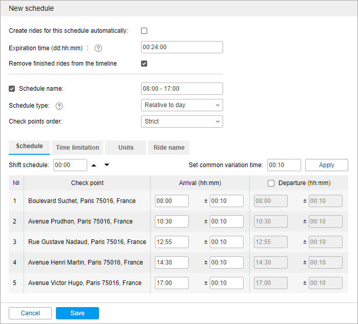 Here you can see the list of all the check points of the route and their visiting time. You can indicate the time of arrival or the time of arrival and departure for every check point. Besides, you can set the variation time which will not be regarded as a violation of the schedule (for example, +/- 5 minutes).