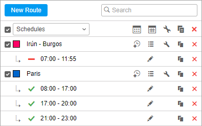 To create a schedule for a route, click on the Add schedule button () next to the route name and adjust the required parameters.