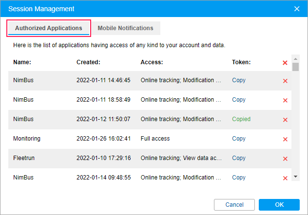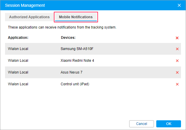 The Session Management window shows the list of applications that have access to your account and the list of devices that can receive mobile notifications from Wialon. The lists are formed automatically after logging in to the application.