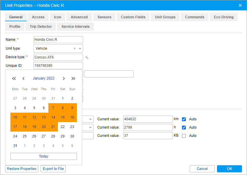 If you change or delete data on a certain tab of the unit properties by mistake, you can restore it. The settings of the properties saved in the last 14 days are available for recovery. These settings are saved automatically on the server once every 24 hours.
