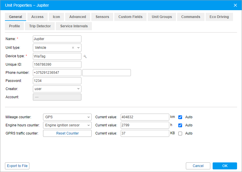 The window of unit properties is shown when creating, editing, and copying a unit. In this window, you can specify different unit properties, configure access to the unit, create sensors, and so on.