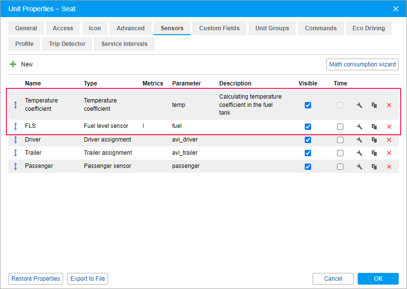 Any liquid can be compressed or expanded at different temperatures, so the readings of the fuel level sensor may not be accurate enough without taking into account the temperature in the fuel tank or, for example, in the fuel tanker. In this case, to get more accurate calculations of the fuel level, you should also create a sensor of the Temperature coefficient type. It allows calculating the temperature coefficient based on the parameter in which temperature or voltage data is received.