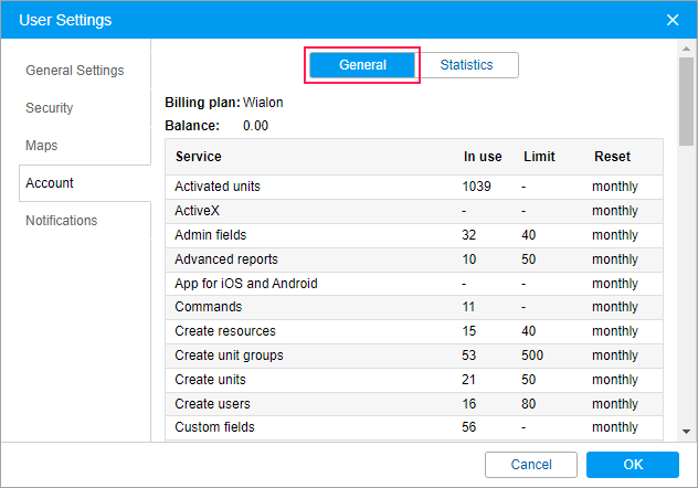 In the General section, the name of the billing plan, current balance, and the table with the list of available services are displayed. The table contains four columns.