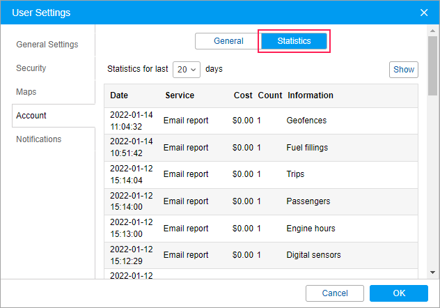 In the Statistics section, you can get information about service charges for the period of up to 60 days. To do this, select the required time interval and press Show.