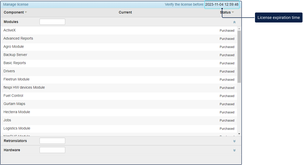 If you want to activate new components, go to your personal account or write to partners@nova-ex.su. After purchasing a component, you will receive an update which you have to install on the System tab. To complete the procedure, Wialon Local is automatically restarted. In certain cases, you may need to refresh the page and clear the cache. The activated components receive the Purchased status.