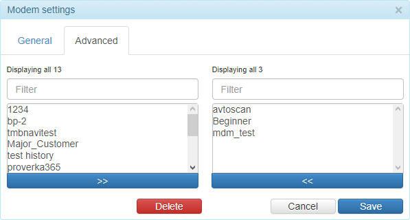 Modem activity can be restricted to selected billing plans. The modem is unavailable for all billing plans by default. To use a modem for a billing plan it is necessary to move the corresponding billing plan from the right column to the left one.