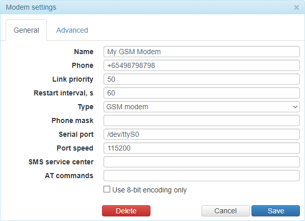 | Serial port | For GSM-modem, you can specify the physical port of the server to which it is connected. |
