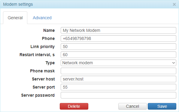 To create a new modem, press the Add modem button at the top of the section. Three types of modems are supported: GSM modem, SMPP gateway, and network modem. Some of the parameters of their configuration are common and others differ.