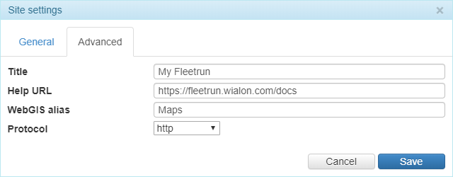 Wasl server URL | This setting is used for configuring data sending from Wialon to Wasl. Here you should indicate the DNS specified in the general settings of the Wasl site preceded by the protocol prefix http or https. If you change the protocol for the DNS of the Wasl site, you should change the protocol prefix for the Wasl server URL as well. In case of any questions, contact technical support. |