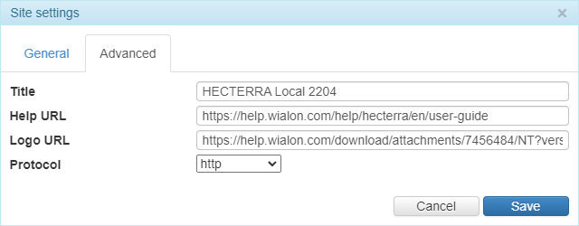 | Report logo | The logo that is displayed in the exported report (files in HTML, PDF). You can use a PNG image which does not exceed 140×30 pixels in size. This option allows applying only one logo (the last uploaded one) to all sites of the Wialon Web type, if there are several of them. It is advisable to set logos for reports and assign them to billing plans in the Logos in reports section. |